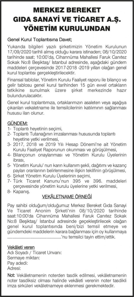 Pay sahibi olduğum/olduğumuz Merkez Bereket Gıda Sanayi Ve Ticaret Anonim Şirketi’nin 08/10/2020 tarihinde saat:10:00’da Cihannüma Mahallesi Faruk Canıtez Sokak No:8 Beşiktaş/ İstanbul adresinde geçekleştirilecek olağan genel kurul toplantısında beni/bizi temsil etmeye ve gündemdeki maddelerin karara bağlanması için oy kullanmaya ………………………………………….’nu temsilci tayin ettim/ettik.